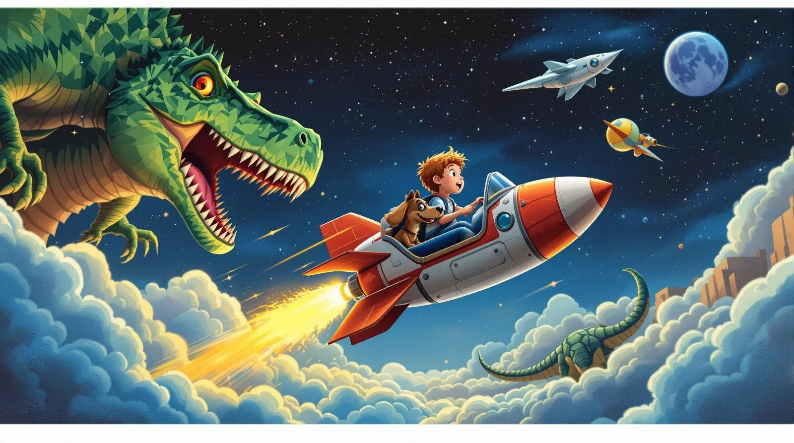 Atlas, a young space explorer from another planet, travels to Earth and returns in a dinosaur shaped spaceship.